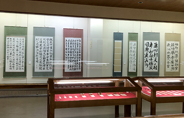 佐久市立天来記念館の比田井天来と小琴の展示室。正面には右に小琴、左に天来の作品が並びます。