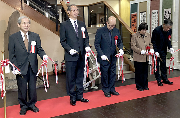 左から臨書展実行委員長の吉川徹さん、教育長楜澤晴樹さん、副審査長の高橋蒼石先生、比田井天来生家を守っている比田井恭子さん、地元代表加藤春輝先生。