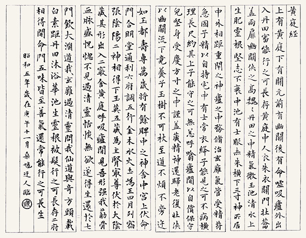 比田井天来存命中の1930年に書かれた、上田桑鳩臨「黄庭経」。原本の字形と線質を見事に捉えています。