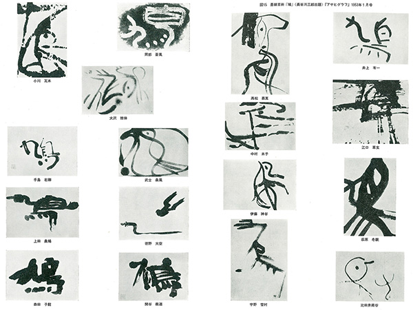 その長谷川三郎が出題した「鳩」を、いろいろな書作家が書き、『アサヒグラフ』に掲載されたのが上の図版です。