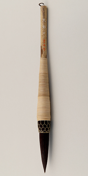 比田井天来が愛用した籠巻きの剛毛筆の覆刻で、黒天尾(馬毛)を使用。弾力のある毛で腰強く、主に楷書や行書に向き、創作作品には変化のある強い線が引けると好評の筆です。攀桂堂製作。