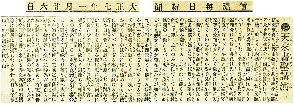 翌1918(大正7)年1月、天来の講演を報じた信濃毎日新聞は、天来を「書聖」と讃えましたが、「この呼び方は自分にふさわしくない。(書聖とは王羲之をさすのであって)自分ごときに値する呼び方ではありません、どうぞ取り消してください」という手紙を新聞社あてに認めましたが、これは実際には投函されなかったようで、今天来記念館に展示されています。