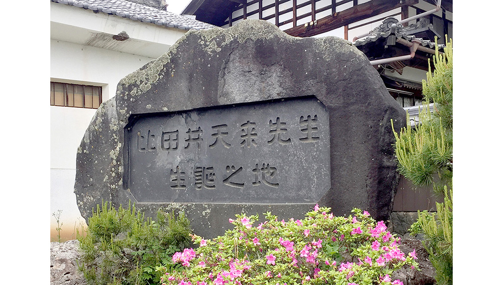碑文の揮毫は桑原翠邦先生(碑陽は隷書・碑陰は木簡風の隷書体)。建立場所は天来生家の門長屋の跡地です。この門長屋は、比田井昭三さんが協和小学校に教員として赴任した時の下宿先でした。この下宿住まいが縁となり、比田井本家当主の道につながりました。結婚して教員を辞し、天来生家の当主として活躍されました。