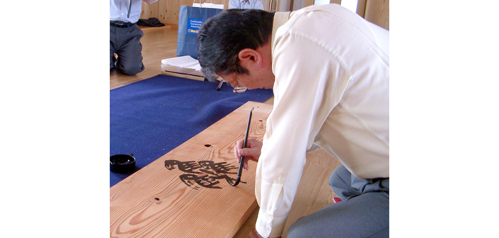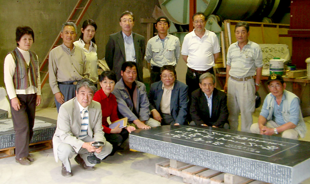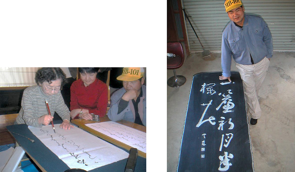 ・石刻は手彫りでないと書家の筆意が表現出来ないという金子卓義先生、比田井和子さんの強い要望により、中国から碑刻家、王建虎さんを招聘し、信州鉄平石(株)清水清さんの作業場で書を石に刻みました。2ヶ月余の滞在で、生活面でも清水さん宅でご苦労いただきました。