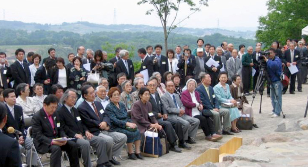 ■天来自然公園竣工式 2006(平成18)年6月4日、田中康夫長野県知事、全国の書家、地元の人達合わせて約150名が参列しました。知事はお祝いの挨拶で、「慣れるより習え」という天来の言葉を引用して話をされました。石碑の序幕は、 石碑の書を書かれた先生のご遺族と書道関係者が幕を引き、地元の小学生もそこに加わり、感動的 でした。9基の石碑は新緑に包まれ、燦然と輝いていました。逝去された金子卓義先生に、新緑の中に佇む石碑の姿をお見せする事が出来なかったことがとても残念でした。