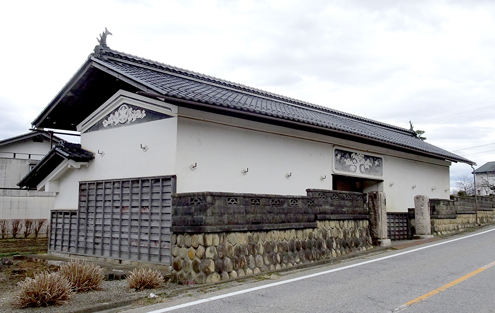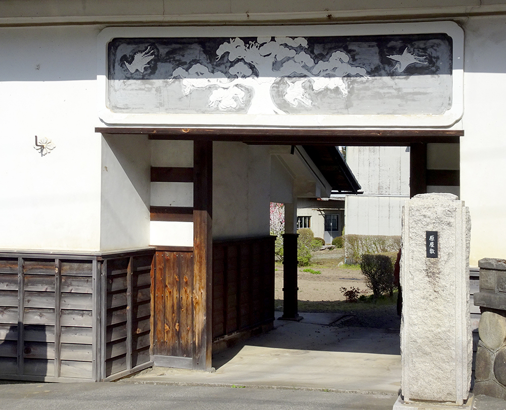 長屋門風の屋敷門には、見事な黒漆喰の地に白い松と二羽の鶴の「こて細工」の彫刻がなされ、白壁で囲まれている。北の妻には丸に橘の家紋、左右にうねる白竜の朱色のひげや鱗など職人芸の丁寧な「こて細工」である。門の両側は米や穀物の貯蔵や農機具等の物置となっている。