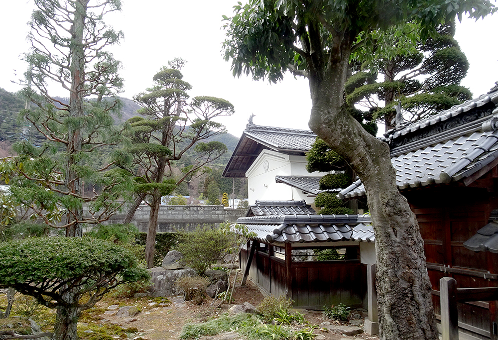母屋と門とを繋ぐ通路も武家屋敷風の構えを備えていたが、現在は途中までとなっていた。庭園には松の木が数本聳え、また横に伸びた松が年月を表している。また、背面には空を目指した杉の樹が直立し、まさに屋敷林を形成している。