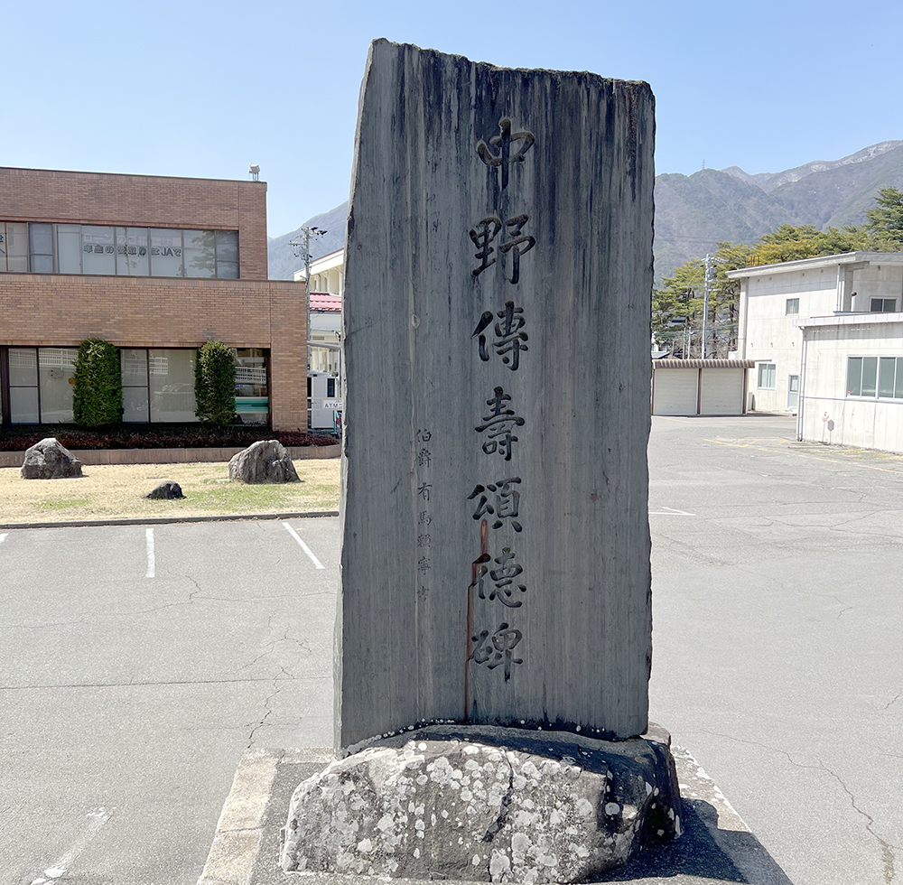 立派な石碑で碑面は、彫が深く「中野傳壽頌徳碑 伯爵有馬賴寧󠄀書」とある。裏面は、中野傳壽が波多村での産業組合活動を活性化し、さらに保證責任組合へと進展させて、日本農村建設の理想を追求した精神の業績を讃えて頌徳するという内容であった。建立主 保證責任波多信用購買販売利用組合とあり、建設委員35名の姓名と外組合員1080名と刻まれている。なかなか見事な石碑で、昭和18年12月の日付がある。書を書いたとされる有馬賴寧󠄀(よりやす)伯爵(1884—1957)は、有馬家の第15代当主で日本の政治家、農政学者、篤志家である。日本中央競馬会にて行われるGⅠ競走「有馬記念」の名前は有馬頼寧に由来する。夜間学校の開校、女子教育、農民の救済や部落解放運動、震災義捐などの社会活動に広く活躍し、農山漁村文化協会の初代会長や日本農民組合の創立にも関わった。1937年に第1次近衛内閣の農林大臣となった。