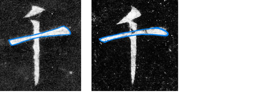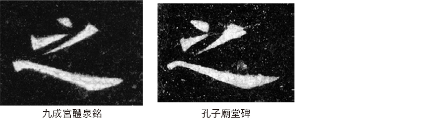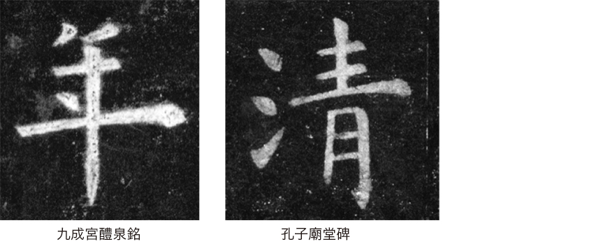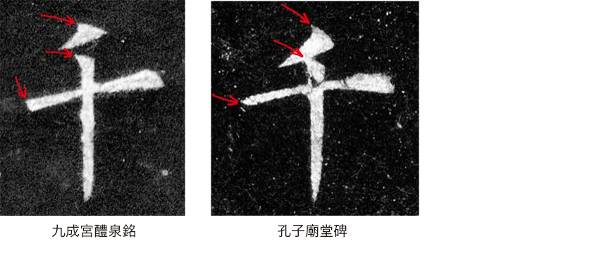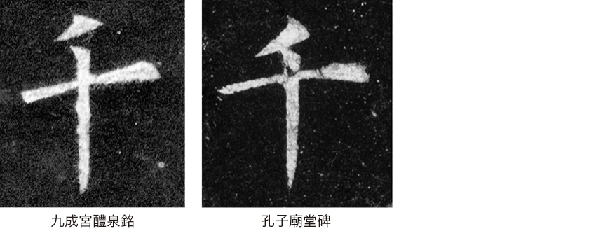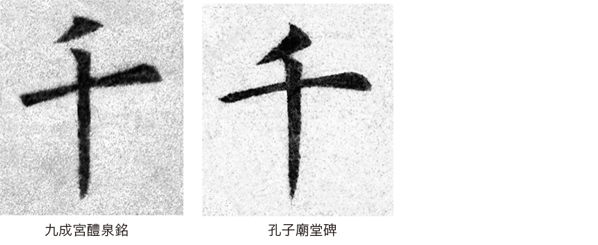 筆を止めるところはどうでしょうか。「千」の横画の場合、九成宮醴泉銘と孔子廟堂碑とでは収筆部も異なっています。止める時の筆の角度が違うのですね。この角度の相異は起筆部の筆の入る角度と照応しているわけです。すなわち九成宮醴泉銘は筆の進行方向に対して鈍角的であり、孔子廟堂碑は鋭角的であるといえます。