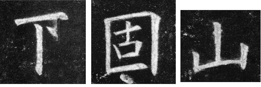 「下」の縦画は鉄柱勢、「固」の第二画の縦画部は垂露勢です。「山」の第一画の縦画に見られるように、縦画の下端が横画に接続する時は常に垂露勢を使います。ついでに言うと、「固」の三本の縦画、「山」の三本の縦画は全部、垂露勢です。横画に接したり、横画が近くにある場合、垂露勢で静かに筆を止めると、その近辺がごたごたしないからです。接筆をすっきりさせるために垂露勢を使うわけです。
