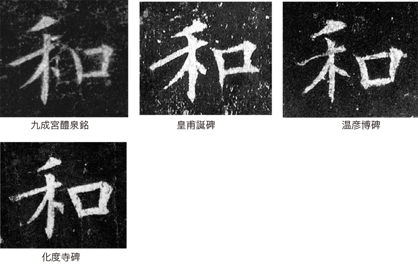 今回の説明は主として欧陽詢の九成宮醴泉銘と虞世南の孔子廟堂碑の作例を比較しながら話を進めました。九成宮醴泉銘と孔子廟堂碑の筆画が異なっているのは、それぞれの用筆が異なっているためであることをお分かりいただいたと思います。この筆画の異なりは筆者によって異なるばかりでなく、同じ筆者の作品の間でも筆画の表現が微妙に異なることは少なくありません。参考までに欧陽詢の楷書の四作品(九成宮醴泉銘、皇甫誕碑、温彦博碑、化度寺碑)に見られる「和」字を以下に掲げます。