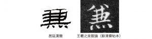 「兼」のこの字体は活字体(篆書に従った字体)とはかなり異なっています。漢代の隷書の時代に、第三横画を短く、また下部を四点に書く字体が出来、行書、草書、楷書はその字体に従う姿が通例になったのでした。