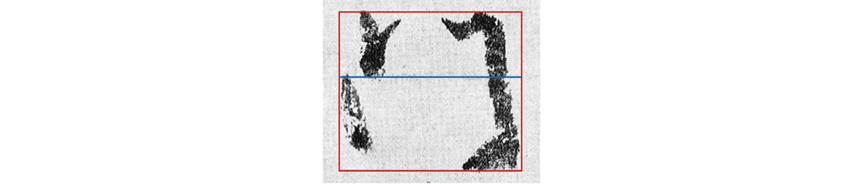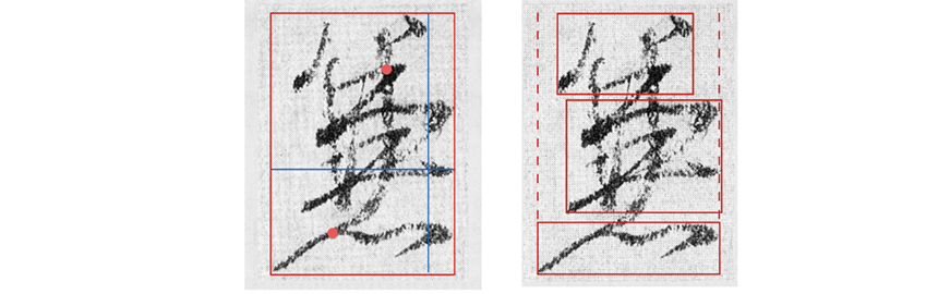 縦、横の補助線で囲まれた左上部の大きさに注目します。赤の点は縦画の上端と下端で、縦画が明らかに右下方に向かっていることが分かります。旁の「見」の左払いは中途でわずかながら方向が変わっています。概形はかなりの縦長です。