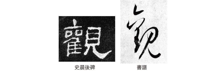「観」(觀)は偏の上部を鍋蓋(なべぶた)+二つの口に書く字体が漢代の隷書の時代に出来ました。草書はその省略形になっています。左右の口をそれぞれ一つの点に省略するとこんな形になります。