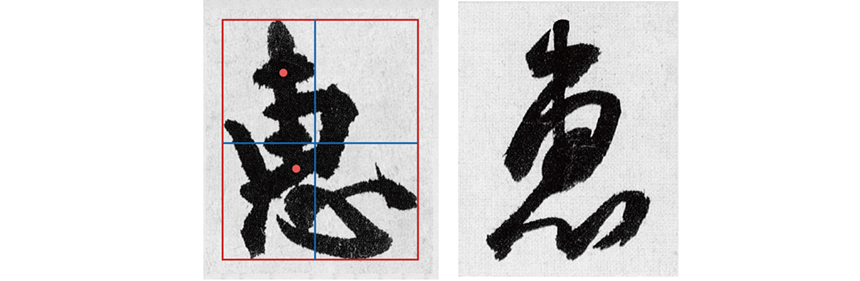概形はかなり縦長であり、左上部の広大さが目立ちます。中心の縦画は明らかに右下方に向かっており、さらに重畳法を露骨なまでに用いています。行書ではしばしば筆意をたどることによって筆順が明らかになる場合があります。この字では「心」の最終画を左上に撥(は)ね上げているところから、縦画を最後に書いていることが分かるわけです。風信帖にもう一箇所、現れる「恵」字を右上に載せました。ここでも中心の縦画を最後に書いてあります。