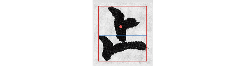 縦方向の筆画がすべて右下方に向かっています。青の補助線は第一筆の始筆箇所を明確にするためです。右端の長い縦画は背勢で右下方に運び、下端で押さえ気味に小休止した後、左下方に撥ねています。この字における最も太い箇所はこの撥ね出すところです。