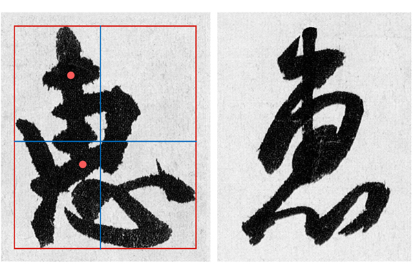 ここに書かれた文字の筆画また筆順はこれで分かると思います。手本はお持ちのデヴァイス上で見ることもできますし、ダウンロードして印刷することも可能です。できれば実際に筆を執って練習し、総論で説明した概形枠を手本および自分の練習作品に書き込んでみましょう。さらに見当をつけて任意の補助線を書き込んでみると、おそらく両者の相違がありありと浮かび上がってくるのではないでしょうか。その相違が認識できれば、再び練習し、相違が無くなるように努めましょう。