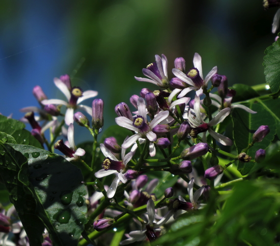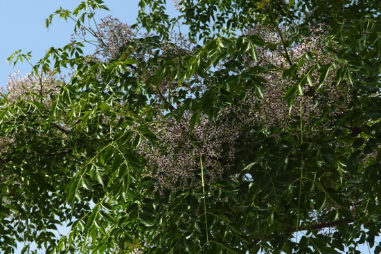 古典に「あふち(楝、樗)」と出て来る植物は栴檀の別名です。「万葉集」の歌などには薄紫の「あふち」の花の姿を素直に詠むものも多いのですが、「会ふ」の掛詞に使って、人に逢ふ、機会に遇(あ)ふ、などの場面に詠み込むことができたので、時代が下ると和歌・和文では掛詞の一方としての役目を負うことの方に重きが置かれる言葉になってゆきます。従って、この植物は和歌では栴檀ではなく専ら「あふち(楝、樗)」の名で登場します。