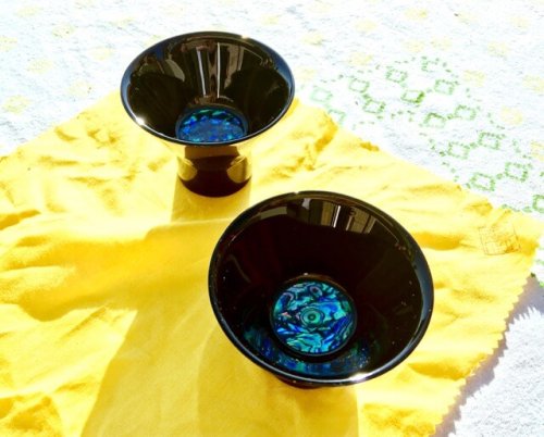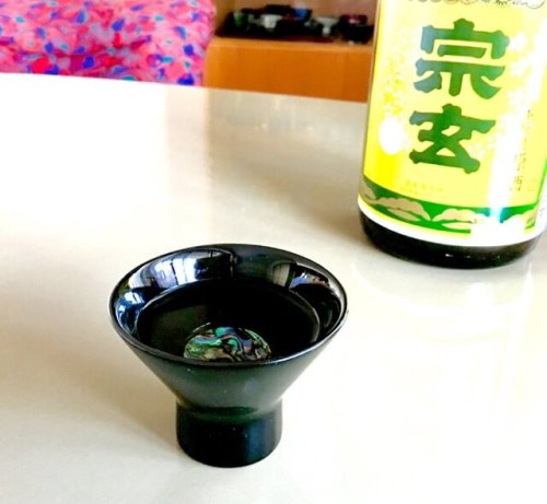 それがヒントになり底の部分に青貝を貼ったぐい呑みを作りました。お酒を注ぐと青く光りはじめます。
