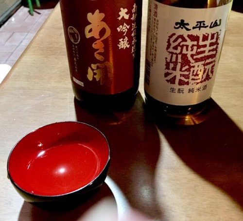 日本海に出て潟上の温泉に入り、盛岡で買ってきたお酒と潟上の地酒をいただきました。あさ開の大吟醸はフルーティで美味。太平山純米は熱燗でいただきましたが魚に合う旨いお酒でした。