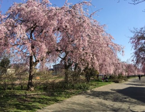 次は福島県会津若松へ。途中枝垂れ桜の名所を見つけてしばしお花見。枝垂れ桜ばかり3km続いているとは凄い!