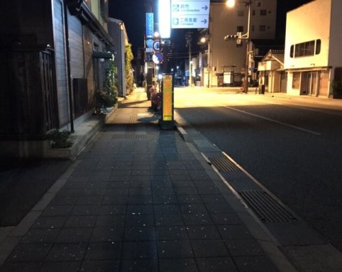 終わりは中心街の歩道の写真です。友達の職人宅にお邪魔した後、実家への帰り道。歩道のコンクリートブロックに貝が埋め込まれています。昼間は分かりませんが、夜になるとこんな感じでキラキラ光り出してきます。