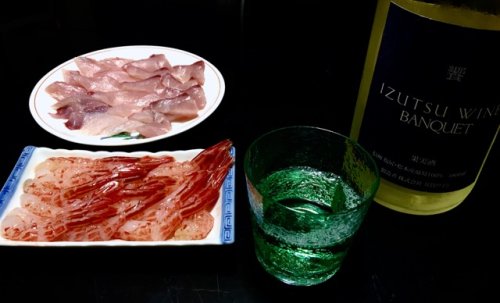 夕食は母親が朝市で買った平政(ヒラマサ)と縞海老(シマエビ)の刺身です。汁は海老の頭と豆腐の味噌汁。帰る途中に長野で買った白ワインと合わせました。「日本食に合うワイン」とラベルに書いてありましたが、それに違わず極めて美味。