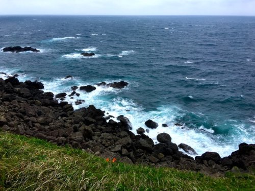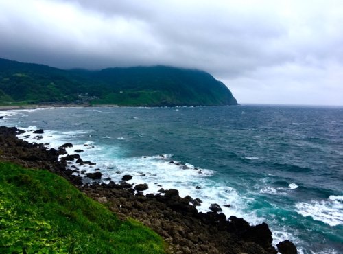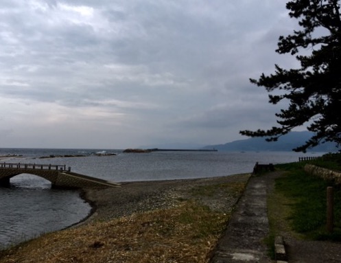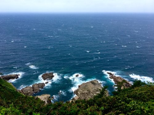 そこからは先は海沿いの道はなく、一旦山越えしてから再度海に出ます。皆月海岸、この辺りは西風を正面から受けるので更に凄い風。また、海に向かって聳え立つ山には雲がかかり、昨年同じ時期に旅した青森県の竜飛崎の途中、津軽半島の風景を思い出しました。