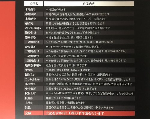 ちなみに、輪島塗は完成までに120以上の工程があります。この工程表は主な工程を説明しています。輪島塗が漆器の最高峰と言われる所以です。