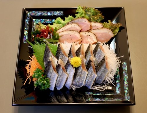 周りからは『螺鈿の色は料理には合わない』と言われています。ただ、自分では色味的に秋刀魚の銀色との組み合わせも悪くはないと思っています。 夏に海で刺したブリの子をお皿に盛った時の青と緑、黄色がとても鮮やかで。その時に脳裏に焼き付いた色がヒントになりました。