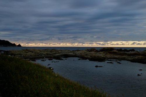 潜る前に磯場の西端に流れ着いた海藻を見て、波の加減と潮の流れが良いのが分かる。また、日没と満潮時間が重なったことで真鯛が西の端に着いている可能性大。中学生の頃から40年以上潜ってきたのでこの磯場については誰よりも詳しいかも。