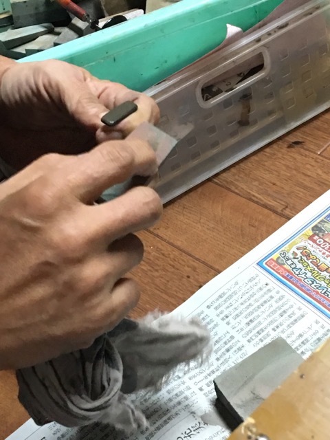 塗を厚く塗るとその分乾くのに時間を要するだけではなく、研ぐのが大変。漆は固まるとコンクリートみたい。また、表面を見て乾いたと早合点して研ぐと、中の漆が乾いてなくて、全体がペロリと剥がれてしまう。これは木工用ボンドと似ています。次の工程のことを考え、薄く凹凸なく素早く塗り込むのがポイントのようです。