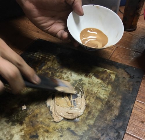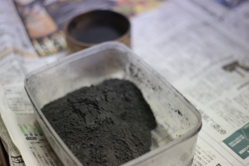 写真は一辺地付け。生漆に米糊(お米から作ったのり)、珪藻土(プランクトン等の死骸でガラス質)を混ぜ合わせて塗り込みます。米糊の量を減らし、珪藻土の目を細かくしながら、一辺地、二辺地、三辺地付けとこの作業を3回繰り返しベースを作っていきます。今回は二辺地からです。工程表をご参照下さい。