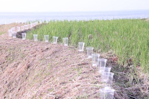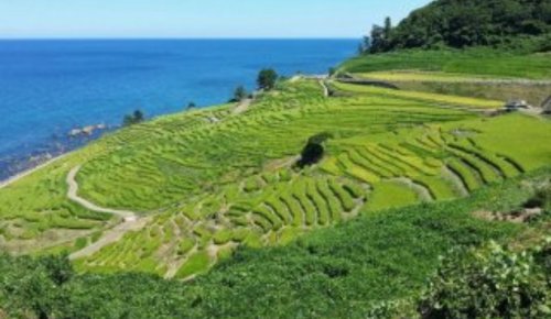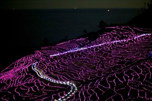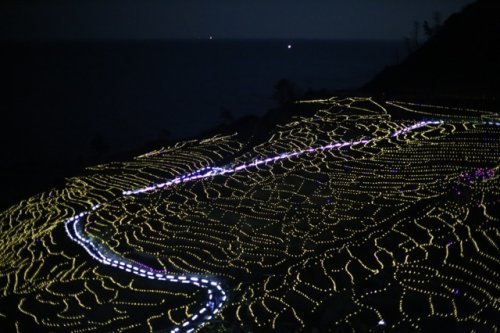 稲刈りが終わった後の棚田。小さな田んぼのあぜ道に設置された約2万個のLEDが夜の棚田を幻想的に灯します。