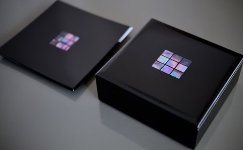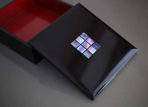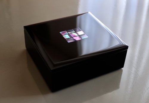 正方形の方は全体的に丸みを帯びているのに対してこちらは角が尖がっています。真ん中に貼った貝も本体の形状に合わせて正方形に貼ったものとは大きさと四角のRを変えています。こちらの方が現代的でしょうか?