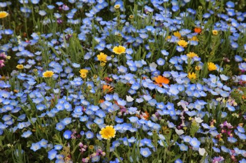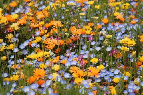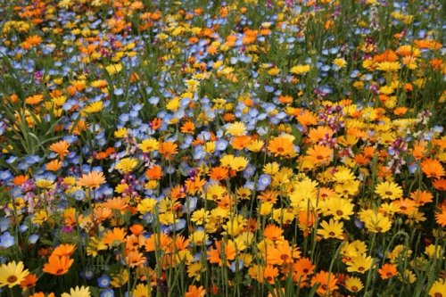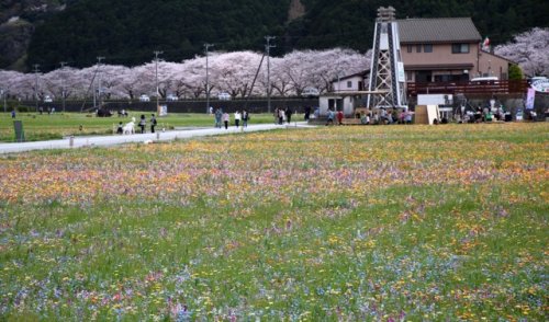 最初は蓮華畑だったのが地元の人達が工夫して色々な花の種を蒔いています。それがこの時期に一斉に花を咲かせ桜とコラボしているようです。
