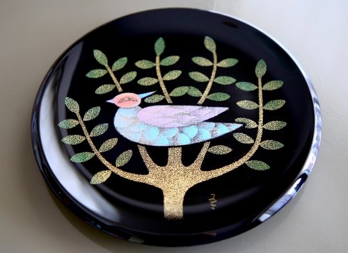 その独自の技法により、沈金を超えて輪島塗りの表現領域を飛躍的に広げ芸術品に高め上げた功労者の一人です。彼は父親よりも一回り年上でしたが、現代的で斬新な作品を多数残しています。ただ、偉大過ぎてか?彼の技法を単発的に継承出来ても、その技法を用いて更に色の表現領域を広げて独自の世界観を構築するような沈金師は残念乍ら出ていないようです。