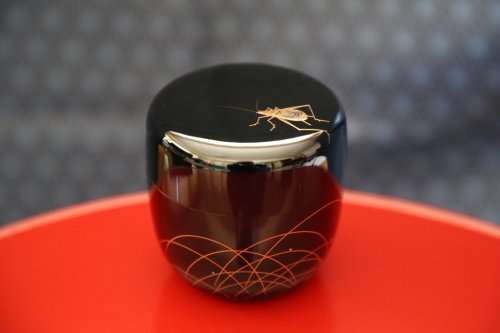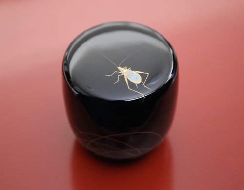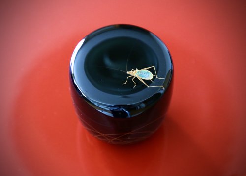 作品は鈴虫が棗の蓋の角に描かれています。羽根の部分には螺鈿を貼り、羽根の模様を金で描いています。模様と模様の間は1mm前後と微細。また、本体の下側には草と露が描かれています(草と露がないものもと2種類あり)。