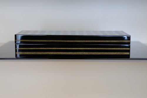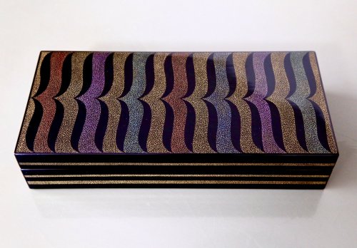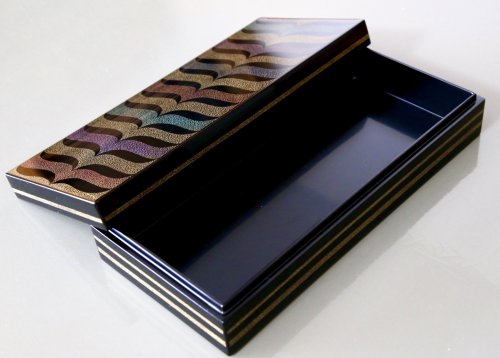 宝石箱の続きです。こちらは蒔絵ではなく、沈金(ノミや小刀で表面を彫り、金や銀の粉末を擦り込んで模様を描く加飾法)の作品です。作家は日展理事や現代工芸美術家協会の常務理事を歴任された輪島塗りを代表する作家の1人でした。