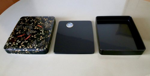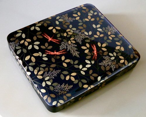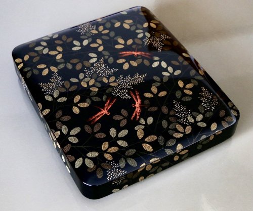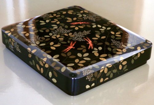 今回は輪島が生んだ国宝級の沈金師の作品をご紹介します。萩と赤とんぼを描いた硯箱です。作者は以前、ご覧いただいた2点の宝石箱を使った作家でもあります。
