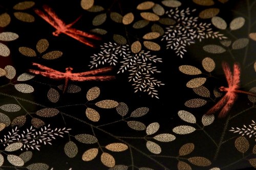 萩は茎と葉は点彫り(ノミで表面に小さな穴を彫る)、花は線彫りです。また、赤とんぼの目と羽根は竹の先端を加工したヘラを使って傷を付け、其々その上に金や銀、その他の金属粉を刷り込み表現しています。