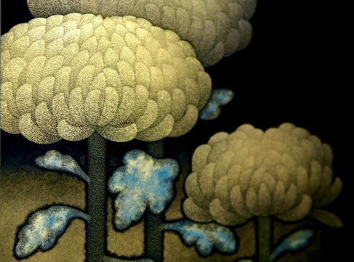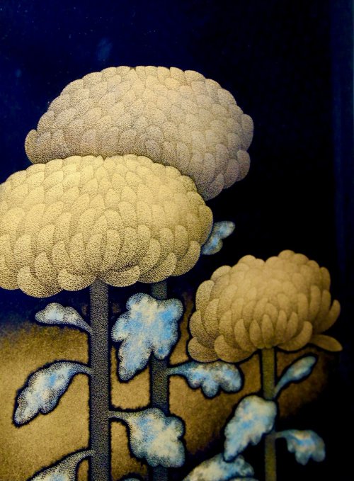 部分的に数えてみました。大きな花弁で大凡600の点があります。花一輪では大凡40,000弱。パネル全体では20万前後でしょうか。それも、ほぼ同じ大きさで。本当、根気勝負ですね。よく見ると花弁が重なり合う境界線は刷り込む金属粉の色を微妙に変えています。そうすることで、奥行きと立体感を創出しています。花にもボリュームがあり、全体として凄く雰囲気のある逸品です。古典的な「輪島塗り」の範疇を大きく超えていますね。