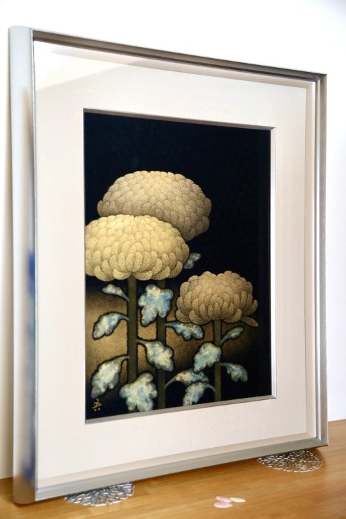 前回に続き、輪島が生んだ国宝級の沈金師の作品をご紹介します。今回は菊の花を描いたパネルです。菊の花が自然に開花するのは10月20日頃~12月20日頃。例年はこれから11月にかけて各地で菊や菊人形の展示会、菊まつりなどが行なわれますが、今年は残念なことに自粛により中止が多いようです。