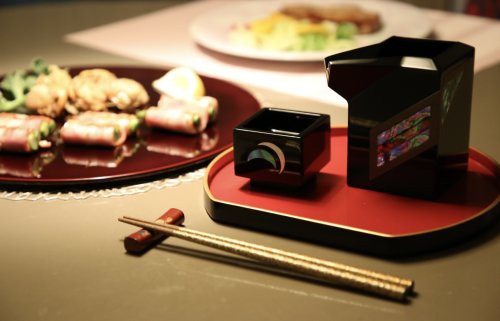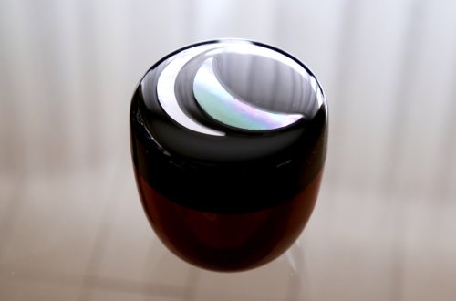 今回の新作は輪島塗りの「三ケ月の桝」です。青い月と白い月を重ねたデザインです。残念乍ら、貝い貼りを依頼した職人が上下を逆さまに貼ってしまいました(涙-涙)。