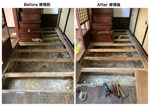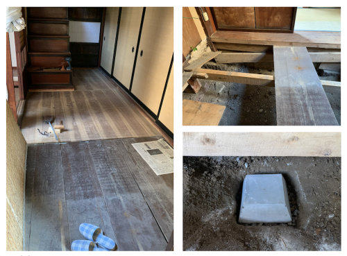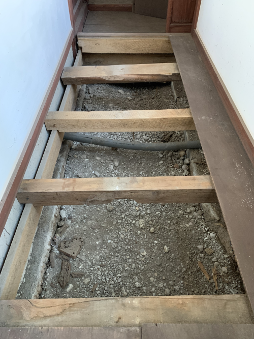 廊下を歩くとキュルキュル音が出る、凹んで歩けない箇所が2箇所あり。ここも同じように床板を捲ると根太、それを支える束自体が外れて落ちていました。