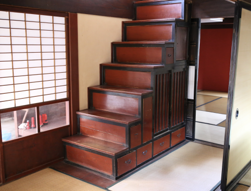 階段をジャッキアップしながら根太を固定して金属製の束で2箇所を下から支えることにしました。念の為、束の下に砕石を敷き固め、その上にコンクリートの束石を水平を出して乗せました。おかげで階段の揺れも収まり、安心して昇り降りが出来るようになり、廊下の凹みも無くなりました。職人の家系故にこの位の大工仕事は自分で熟します。ただ、雄に100kgを越すような階段のジャッキアップは怖かったです。このタンス階段、朱と黒のツートンで何気に趣があります。