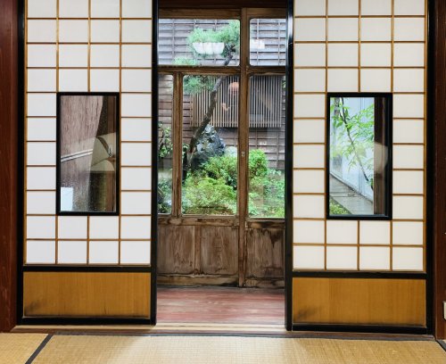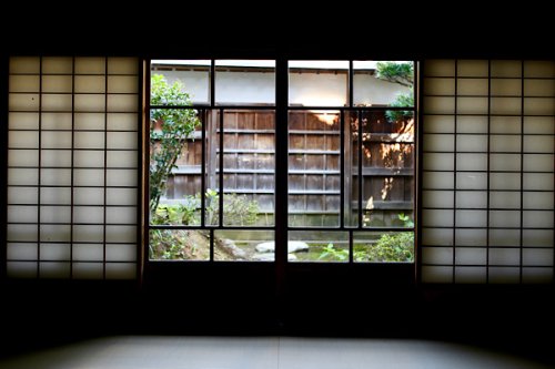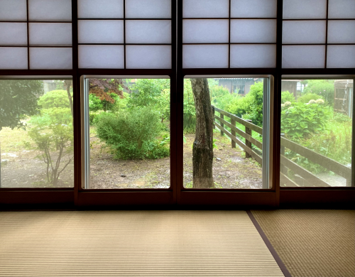 茶室から見る庭はこんな景色です。障子戸を全開にすると白けそうな庭の景色も雪見障子だど程良い景色になるのが気に入っています。ここでは茶器をお見せしようと思っています。また、茶道や着物の趣味の会の皆様とコラボしたいと思っています。