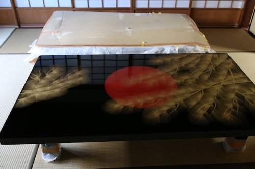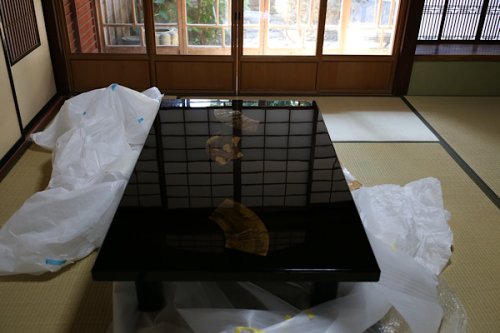 また、この部屋に展示する作品の搬入を始めました。部屋の中央に鎮座するのが「松陽松」という6尺サイズ(182cm*106cm)の大きな座卓。迫力があり圧倒されます!
