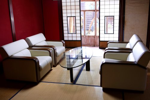 以前からギャラリー用に導入することを決めていたメーカーのソファーとガラステーブルです。どちらも関係者からは和室には合わないと反対されたのですが、僕の意見を通させてもらいました。実際に置いてみると赤い漆喰の壁とも合っているように思います。庭も綺麗になったのでここから見る庭の景色も一段とグレードアップしたように思います。