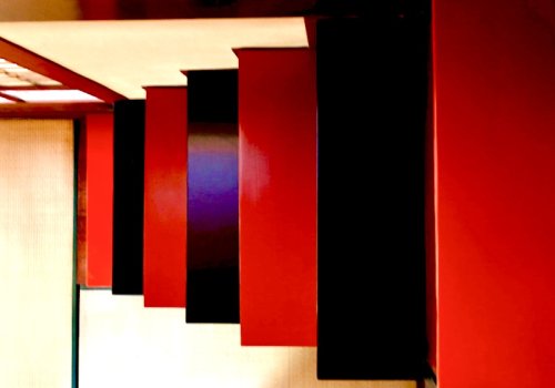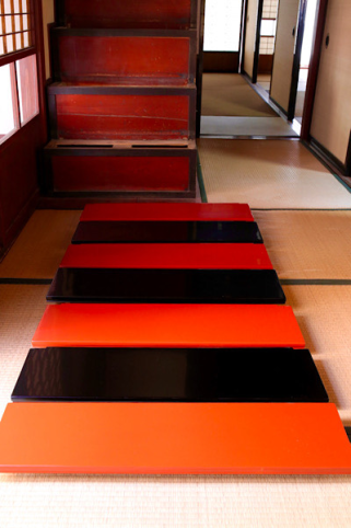 階段の上から見下ろすとピアノの鍵盤のようにも見えます。少しお洒落に見えませんか?今後は階段としての使用だけではなく、商品撮影時の展示台としての活用を考えています。漆黒の作品は朱の踏み板、赤い作品は漆黒の踏み板の上に乗せる予定です。